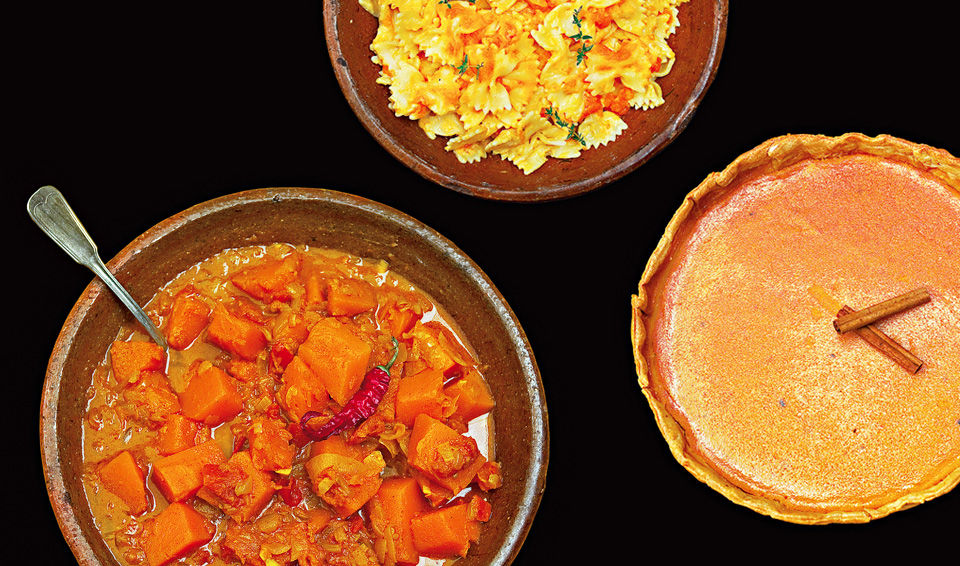 Ao fazer uma sopa ou um puré, por exemplo, asse-a no forno, em vez de a cozer, temperando com azeite, sal e alecrim. A abóbora liga bem com castanhas, cogumelos, queijos, bacon, mel, amêndoas, pinhões, nozes, canela, noz-moscada, alecrim, salva ou o que a sua imaginação lhe ditar. Quando tiver tempo faça puré, congele e use numa pasta como este farfalle que sugerimos. O caril também é uma excelente forma de usar a abóbora e tanto pode ser um acompanhamento de uma carne assada como um prato principal. Para terminar, uma versão da famosa pumpkin pie, que bem pode começar a fazer parte das nossas sobremesas para os dias frios.