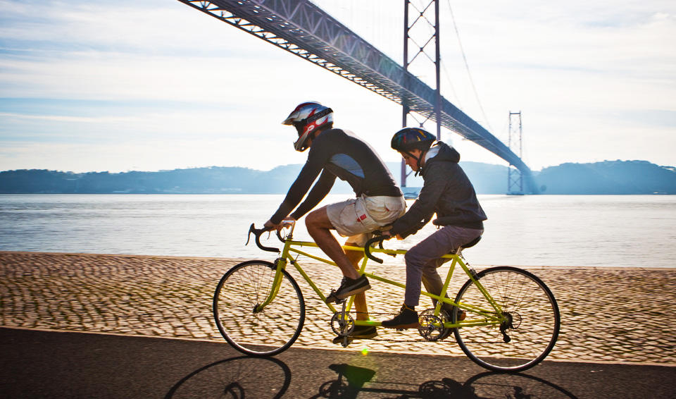 Agora o veículo é amarelo, um tesouro vintage. «Tem uma circunstância raríssima», diz Gonçalo Bettencourt. «O facto de ter sido criada de raiz para ter dois lugares e para ciclistas invisuais. A maior parte das Tandems são adaptadas de bicicletas normais.» O passo seguinte foi contactar o Centro Helen Keller, que aceitou de imediato a ideia. «É importante normalizarmos as brincadeiras», diz Joana Silvestre, professora de Ensino Especial na instituição. «A bicicleta é capaz de ser o maior símbolo de conquista de autonomia. Começamos com o triciclo, passamos para o veículo com apoios de rodinhas e depois a bicicleta de duas rodas. Ter essa experiência é um estímulo tremendo, porque até aqui isso estava-lhes vedado.»