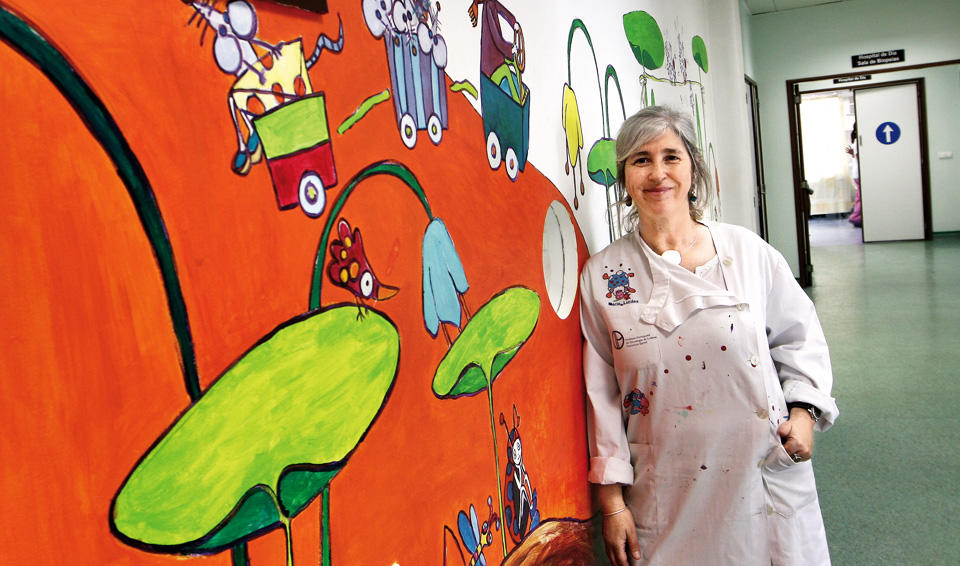 Das paredes do serviço de pediatria do Instituto Português de Oncologia (IPO) de Lisboa espreitam fadas e gnomos, voam borboletas e libelinhas, erguem-se árvores e flores que fazem companhia às crianças internadas. A responsável pela alegria e colorido do espaço é Anabela Mota, a artista plástica que todas as quartas-feiras leva um atelier de pintura aos doentes de palmo e meio.