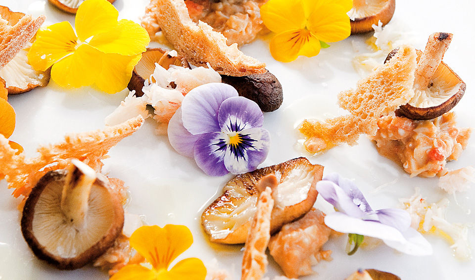 Salteie os shiitake em azeite e tempere com sal. Num prato, disponha a sapateira e as tostas partidas, sobreponha os cogumelos e decore com as flores. Por fim, tempere com azeite e pimenta preta.