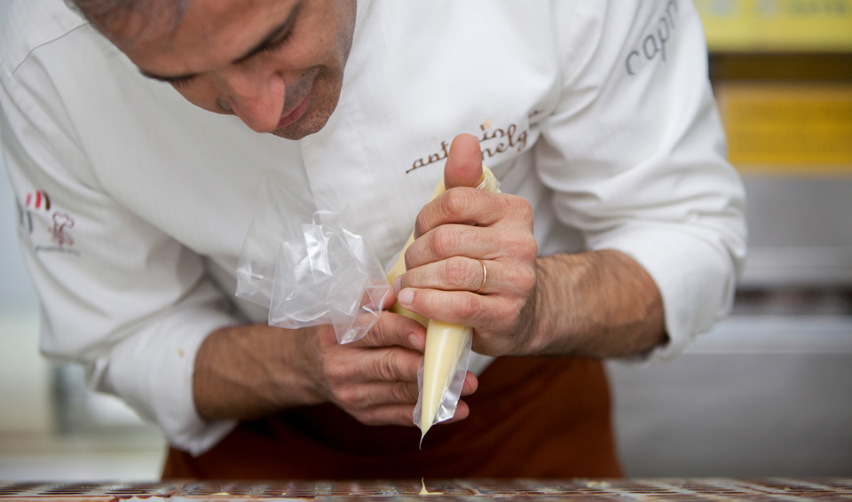 «No princípio causei alguma estranheza aos clientes, mas assim que provavam ficavam a gostar e agora já são eles que me perguntam que surpresas estou a preparar», conta António Melgão, enquanto recheia os bombons acabados de desenformar com uma aromática ganache de azeite.