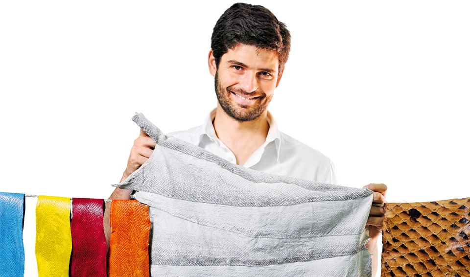Quando vai ao supermercado comprar uma embalagem de bacalhau ou de salmão, demolhado e congelado, fique a saber que a pele desses peixes pode estar nos sapatos, no vestido, no casaco ou nos acessórios que alguém está a usar ou a revestir uma cadeira, sofá ou qualquer outra peça de mobiliário lá de casa. Isto porque a empresa de peixe congelado Soguima resolveu aproveitar o que dantes ia para o lixo e transformar esses desperdícios em moda. «Durante muitos anos pagávamos a uma empresa para transformar o desperdício em farinha para comida de animais. A ideia de dar uma nova vida a esta matéria-prima começou a tomar forma há alguns anos, e para a concretizar fizemos vários estudos, testes, experiências de cor e consistência», diz Daniel Guimarães, um dos responsáveis pelo Departamento de Investigação e Desenvolvimento da Soguima, fundada há um quarto de século por dois irmãos – António e Manuel Guimarães – e sediada no concelho de Guimarães.