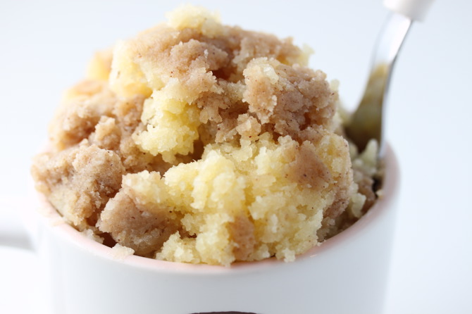 Bater tudo por esta ordem e levar ao micro-ondas numa caneca untada durante um minuto, na potência máxima. Polvilhe com açúcar e canela (facultativo) e… bom apetite!