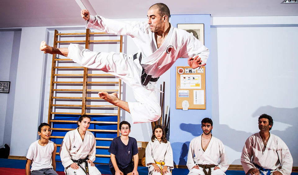 É um salto para o futuro, este que se vê Hugo Pedro dar na fotografia. Há dez anos que este diretor de operações de uma empresa de sistemas de informação dá aulas de karaté – voluntariamente. E o seu projeto de combate à exclusão social pelas artes marciais tem dado frutos. Há hoje dez formadores e mais de 160 crianças a frequentar o Núcleo Karaté Shotokan de Lisboa. É esse o nome da associação sem fins lucrativos que ele fundou.