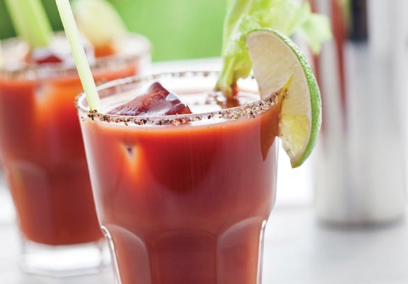 Num shaker com gelo coloque o sumo de tomate e o bloody mix e verta de um copo para o outro. No final verta para o copo e decore com os vegetais.