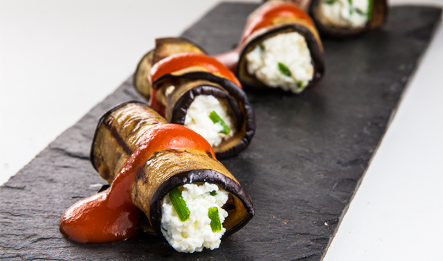 INGREDIENTES: beringela, requeijão, manjericão ou cebolinho, sal, pimenta. Molho de tomate: 1 lata pequena de tomate pelado, 1 dente de alho, 2 c. de sopa de azeite, 1 c. de chá de açúcar, sal.