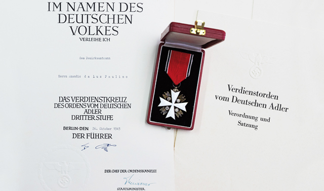 Em dezembro de 1943, após dois meses de grande insistência da Legação Alemã em Lisboa, o ministério dos Negócios Estrangeiros autorizou que quatro cidadãos portugueses fossem agraciados com a Ordem da Águia Imperial Nazi. Na correspondência agora encontrada no sótão do Museu Municipal percebe-se que houve uma negociação intensa com o Ministério do Interior – e que Lisboa só autorizaria as homenagens mediante condições. Vitorino Cuco, o chefe do posto da Guarda Fiscal da Arrifana, José Viriato-França, comandante da Legião Portuguesa em Aljezur, Amândio da Luz Paulino, administrador do concelho, e o próprio Albano de Oliveira, presidente da câmara, envergariam as insígnias de Berlim.