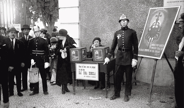 O objetivo era a construção de um pavilhão para os pacientes mais pobres e sem meios de combater a terrível doença. Contrariando o que se lê no cartaz da fotografia, o jornalista do DN salientava não se tratar de dar uma esmola, mas sim do exercício de um dever cívico: «Não se trata de um peditório aborrecido que importuna os transeuntes com o aspeto triste da pedincha.» Seria antes uma contribuição cidadã para suprir aquilo que «o Estado não pode porque o orçamento o impede de construir o pavilhão de internamento de cancerosos pobres», lia-se no DN, que informava ainda que as ações do dia anterior, à porta do Jardim Zoológico e na Sociedade Hípica Portuguesa, tinham corrido muito bem. Dos donativos recebidos, entendeu o jornal destacar, talvez pela avultada quantia, o de «Ricardo Covões, ilustre empresário do Coliseu dos Recreios»: 500 escudos. Veja na galeria outras fotografias deste peditório.