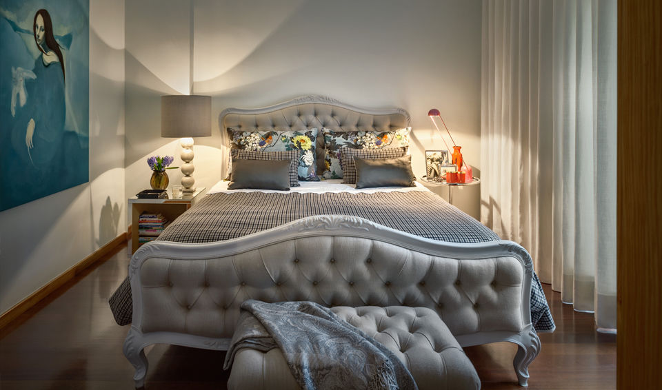 Feminino e eclético, o projeto de Cristina reuniu peças vintage com clássicos do design – uma decisão tomada para conferir «elegância e, acima de tudo, um caráter intemporal ao espaço», sublinhado pelas paredes em rosa-velho suave e as longas cortinas em linho branco. Além destes elementos, a proprietária possuía alguns objetos tribais que foram integrados na decoração, convivendo com as peças contemporâneas desenhadas por Cristina e com uma impactante obra de arte de João Louro. Já para as paredes do quarto, a designer escolheu o verde-água, que ganha ainda mais vida quando conjugado com pequenos apontamentos de cor como as almofadas com pássaros, o candeeiro de mesa vintage cor-de-rosa ou o quadro de Paulo Damião.