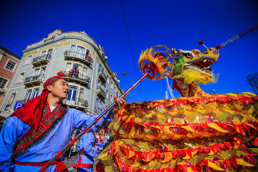 A procissão ainda vai no adro. Centenas de alunos da Escola Chinesa de Lisboa caminham agora pela avenida, e depois ainda hão de vir associações de amizade dos dois países. O governo chinês apostou forte nas celebrações em Portugal e enviou para o outro lado do mundo um enorme grupo de alunos da Escola Secundária Pui Ching, de Macau, além de uma companhia de Ópera Wu, que atuarão no domingo no palco montado no Largo do Martim Moniz. «Há uma equipa a gravar esta festa para a CCTV e o que está a acontecer em Portugal vai passar no maior canal de televisão do mundo. Neste momento, há mais de 400 festas do Ano Novo Chinês em 130 países do mundo. Lisboa tem o sexto maior festejo na Europa», diz Jianping, o homem que montou o evento.