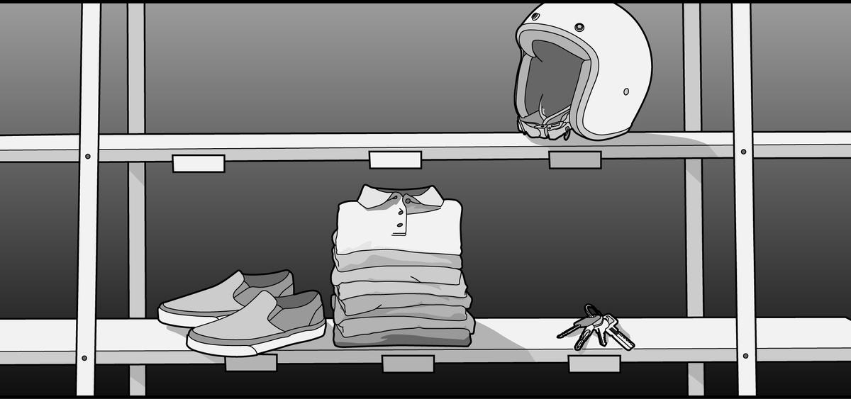 “T-shirt preta; calças de ganga; ténis pretos”.