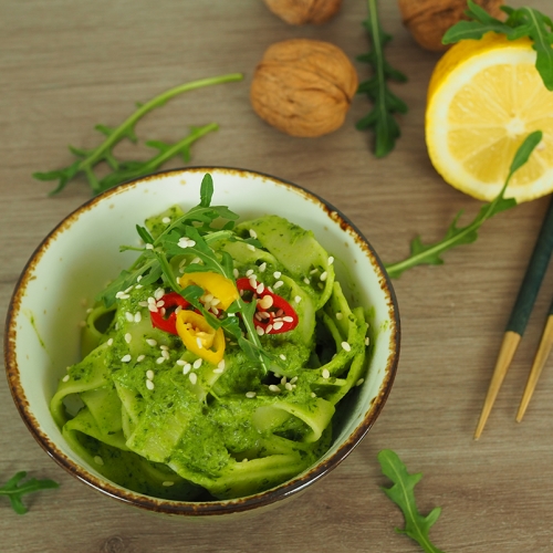A rúcula também pode ser usada em receitas doces. Preparei crepes. Eis uma boa forma de as crianças comerem mais legumes sem darem conta.