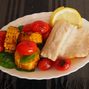 Receita de milho com legumes e peixe grelhado